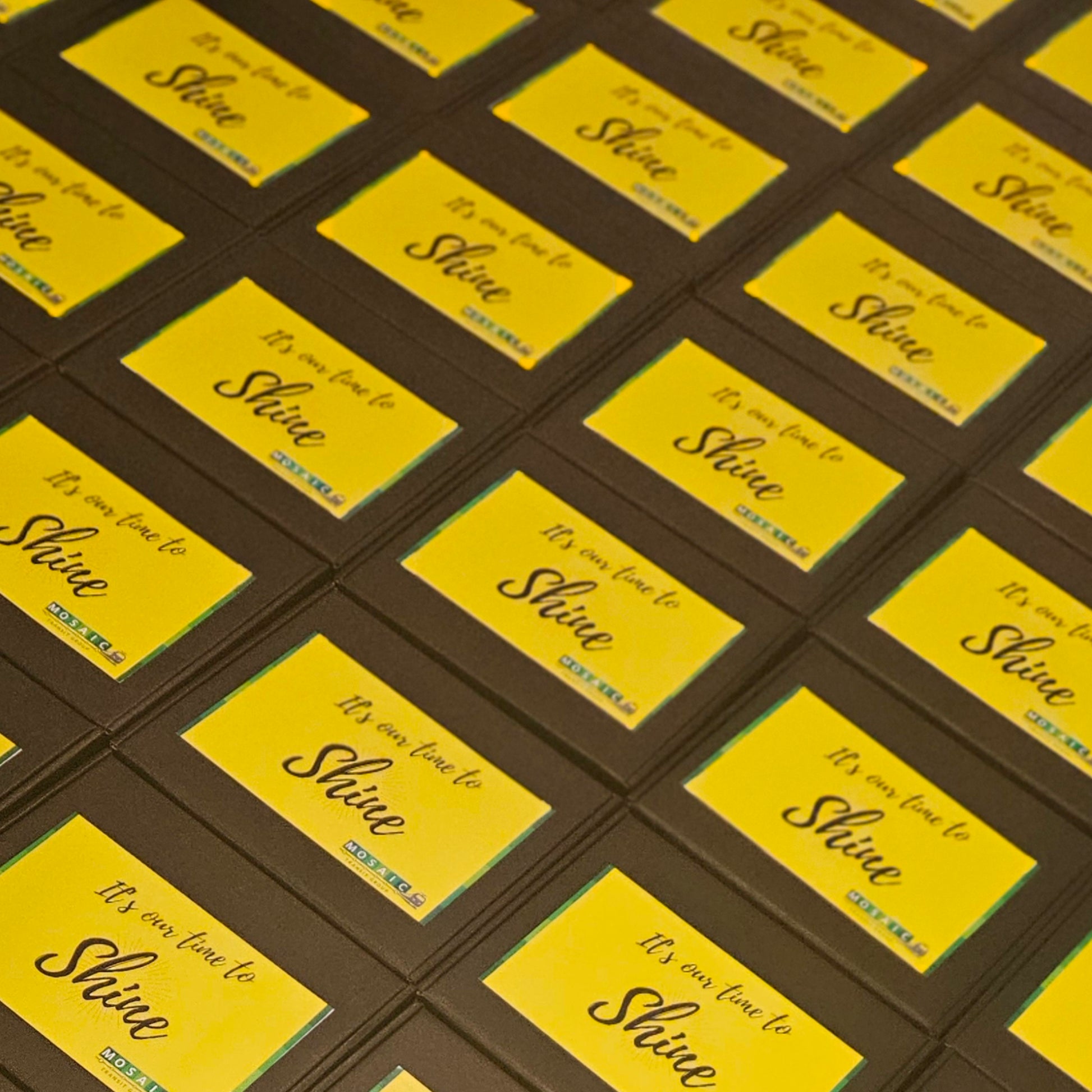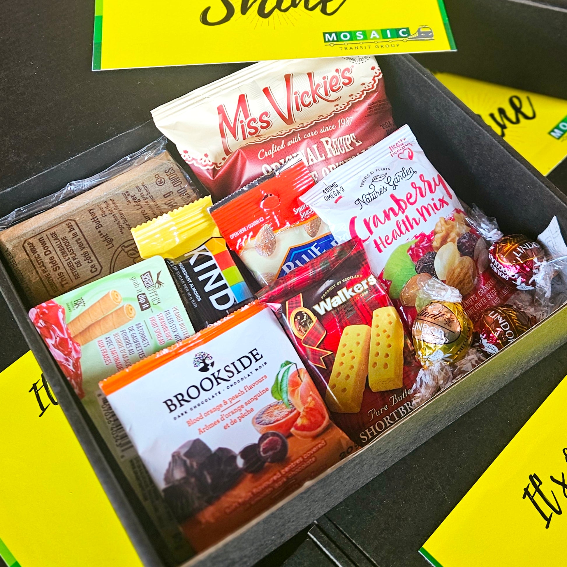 The corporate hampers curated for MOSAIC TRANSPORTS embraced the theme "It's Our Time to Shine!" This vibrant concept was creatively reflected in the design of the outer box, setting an exciting tone. Inside, the hampers offered a delightful assortment of treats, including a mix of sweet, salty, and popping edibles, ensuring a varied and enjoyable snacking experience. Each item was carefully selected and perfectly packaged to enhance the overall presentation, making the hampers a memorable and thoughtful gift. This combination of creative design and diverse goodies was designed to celebrate and elevate the spirit of MOSAIC TRANSPORTS.