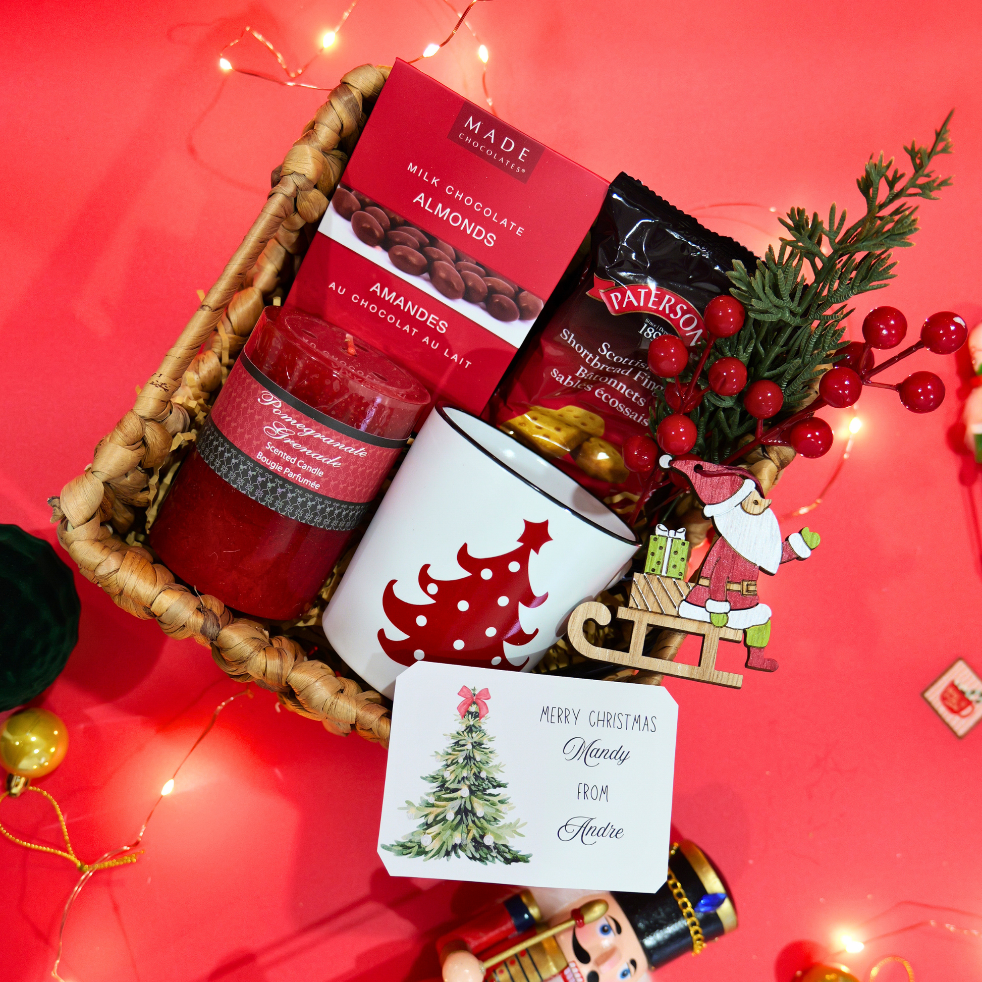 A cozy Christmas gift basket filled with festive treats, a soy candle, holiday mug, and décor—perfect for warm, heartfelt holiday gifting across Canada.