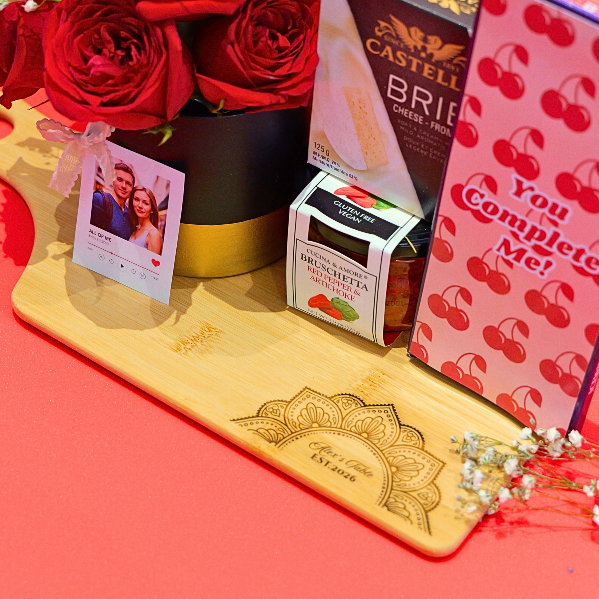 Yes, this Valentine gift hamper allows you to customise the cheese board engraving and add a personalised Spotify song with a photo.