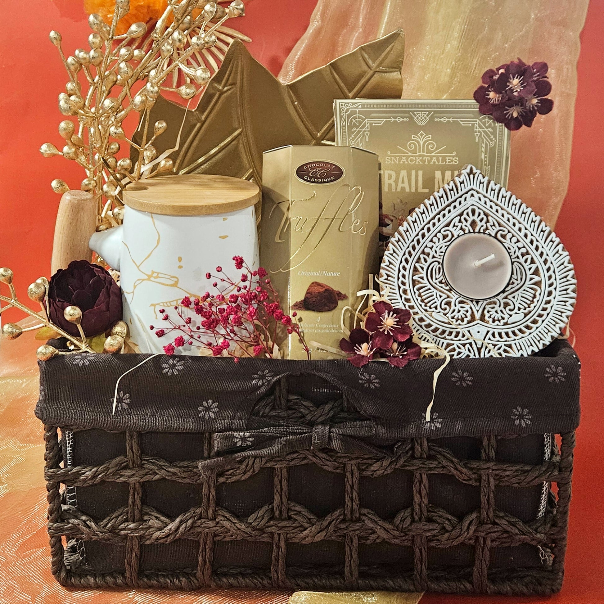 Bring home a touch of elegance with Everything Gold, a weaved metal basket filled with golden-themed delights. Designed to impress, this luxurious hamper is the perfect way to celebrate life’s special occasions. From indulgent gourmet treats to a stylish marble mug and decorative diya, every piece in this basket reflects warmth, tradition, and sophistication. A thoughtful choice for festive gifting, anniversaries, or corporate celebrations.