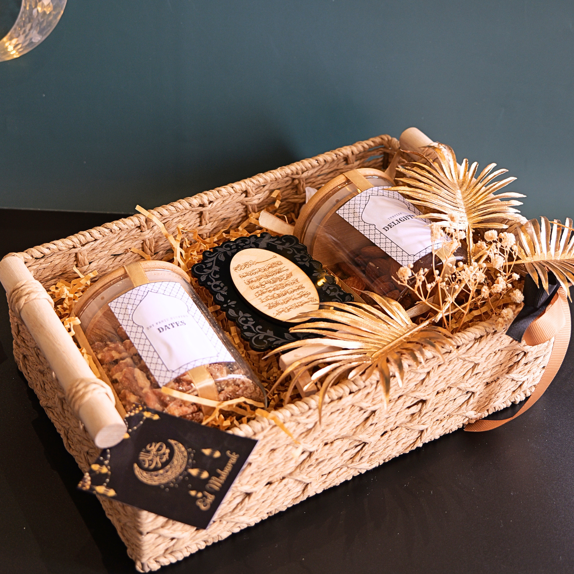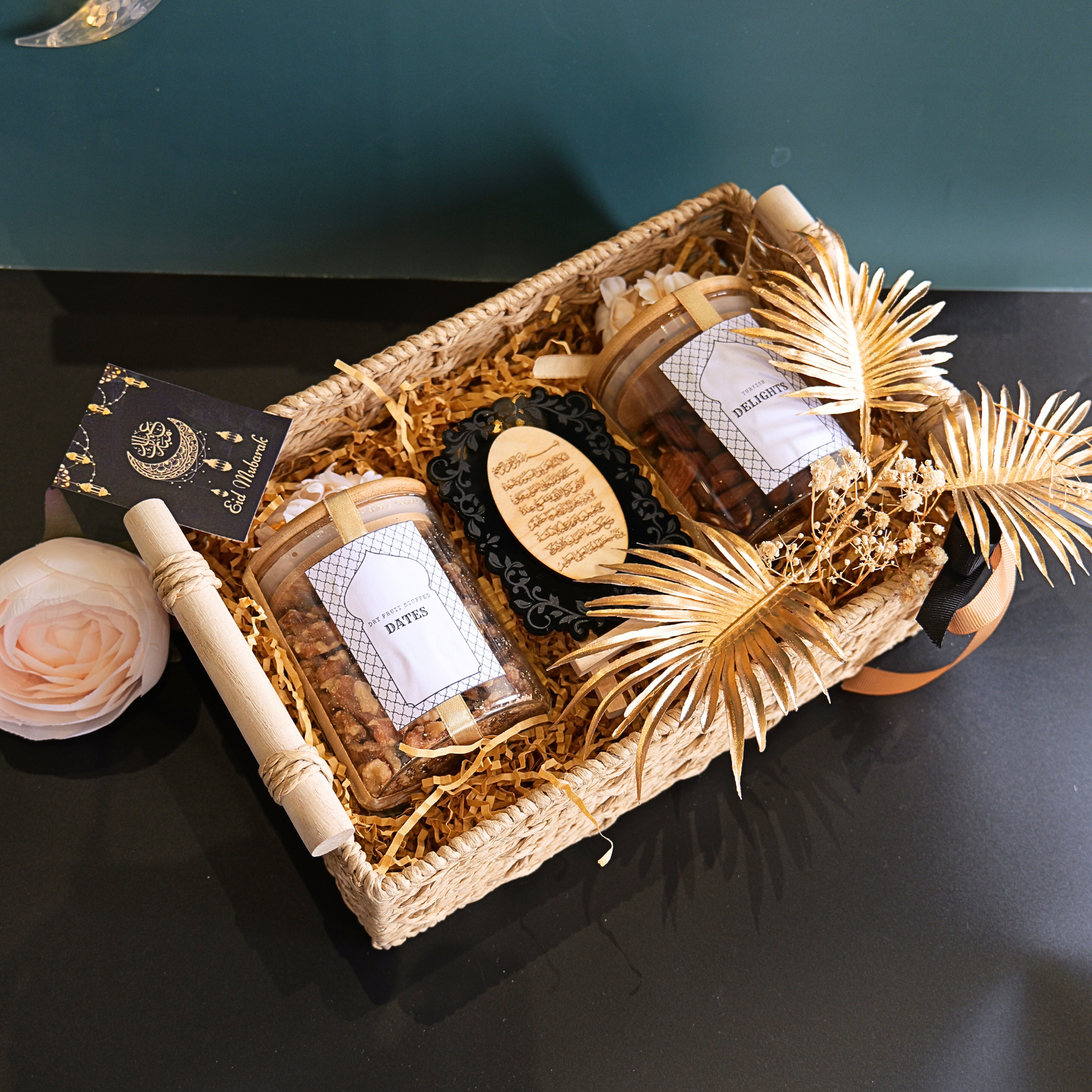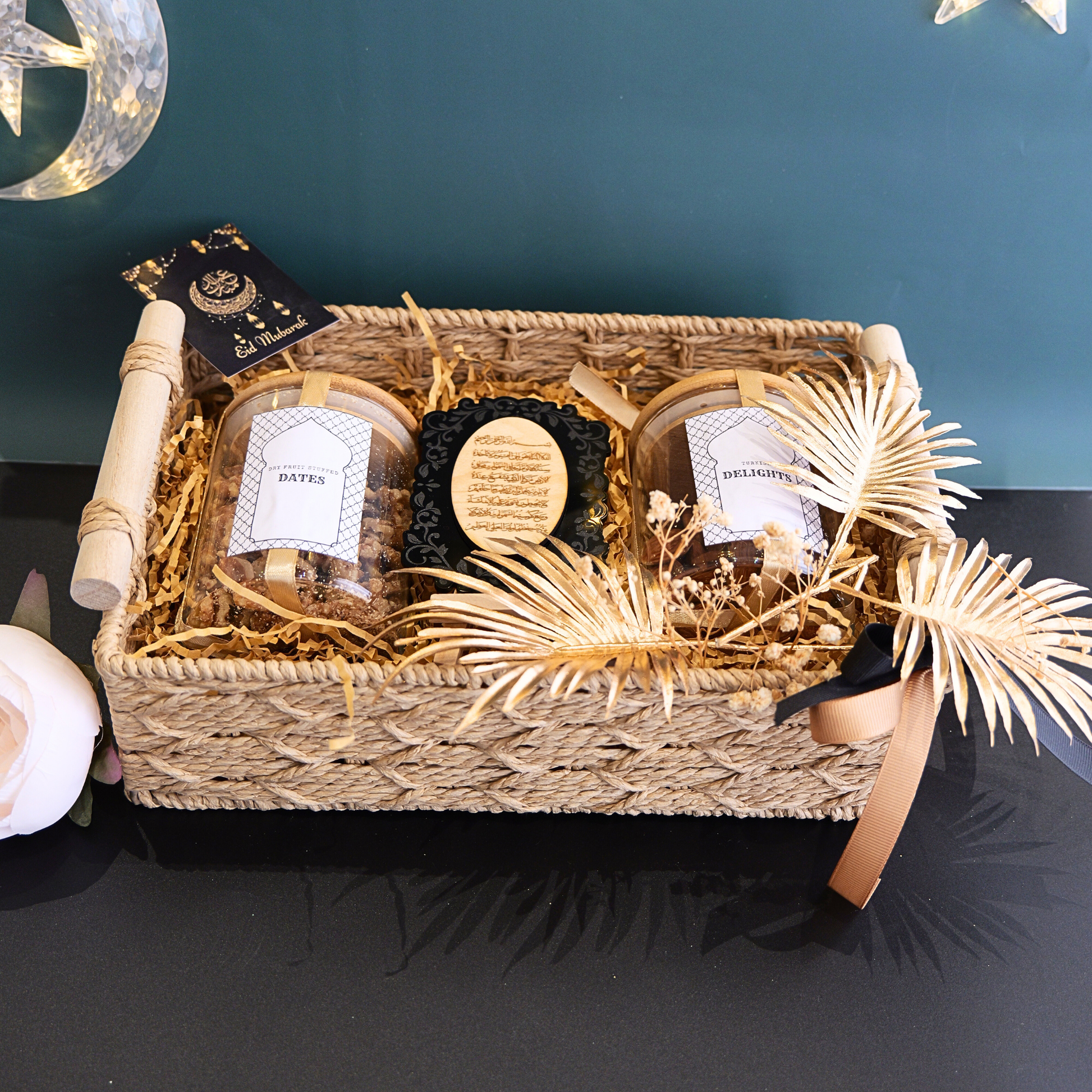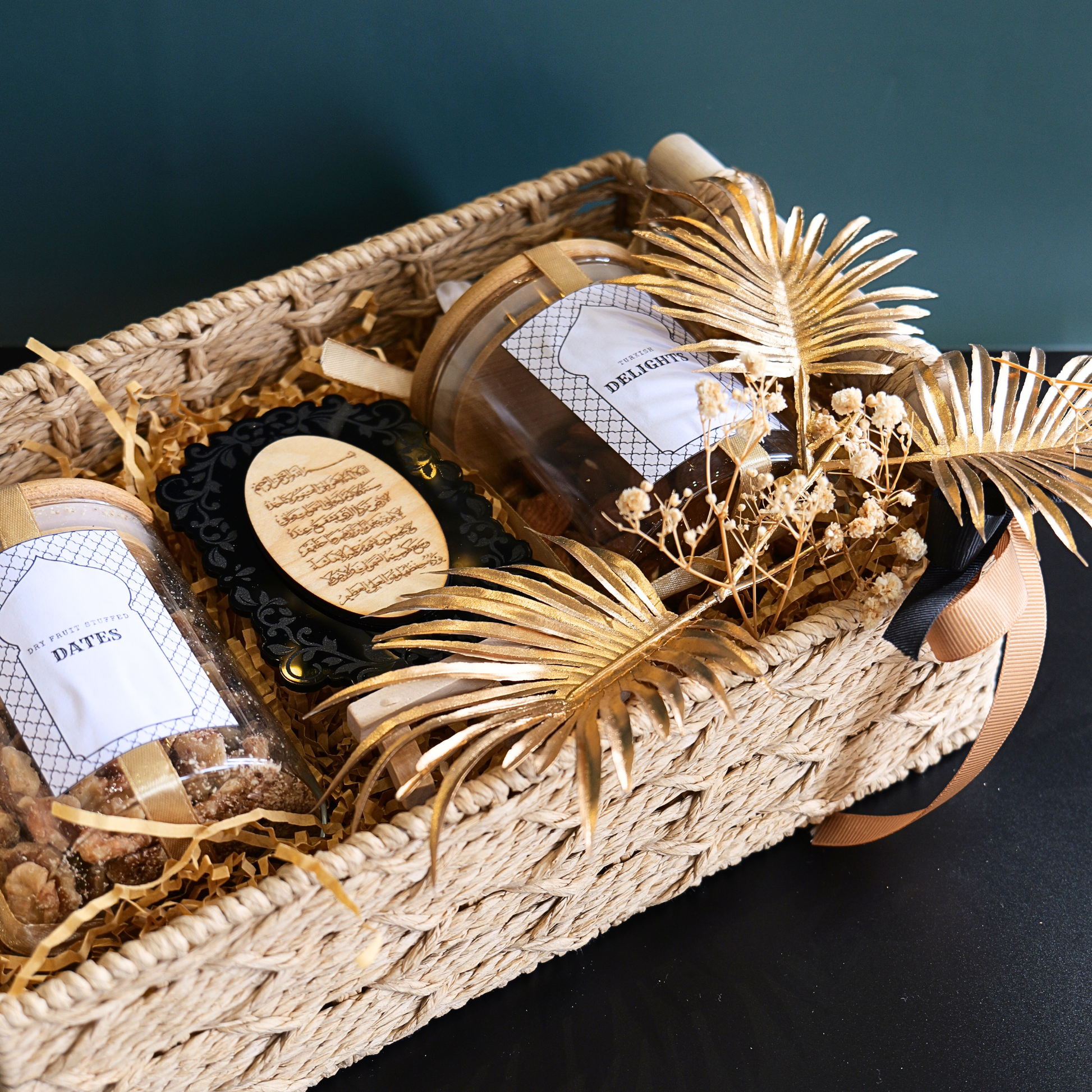 Rectangle beige basket with a pair of turkish delights & stuffed dates along with black ayat al kursi.