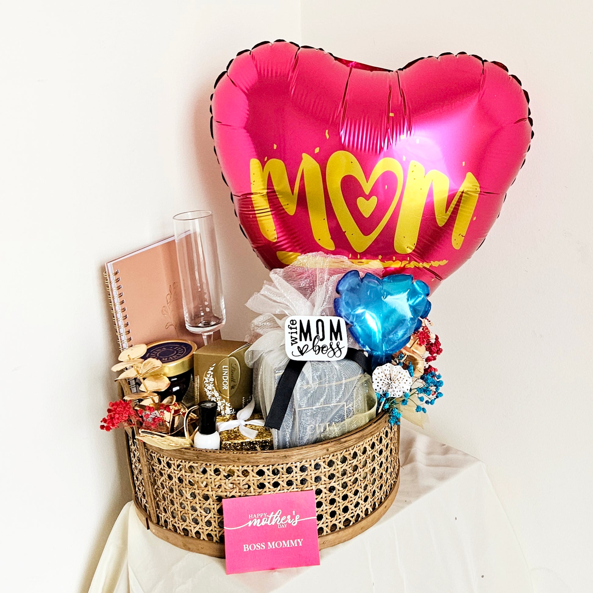 Presenting the 'Boss Mom' Hamper, set up with a hot pink heart-shaped balloon and filled with: