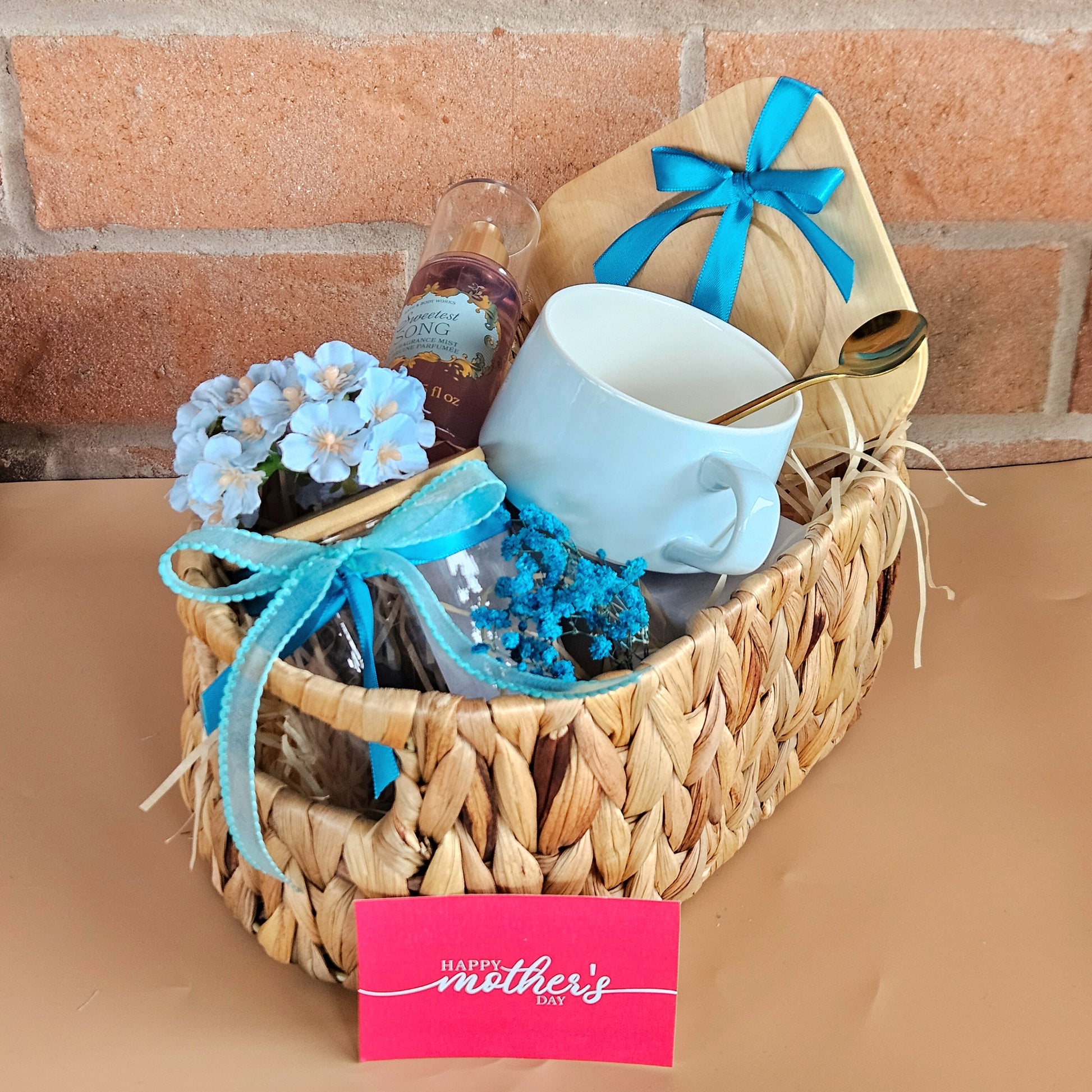 Small Oval Cane Basket with Cup & saucer along with salted crackers in a airtight container and a body mist from bath and body works