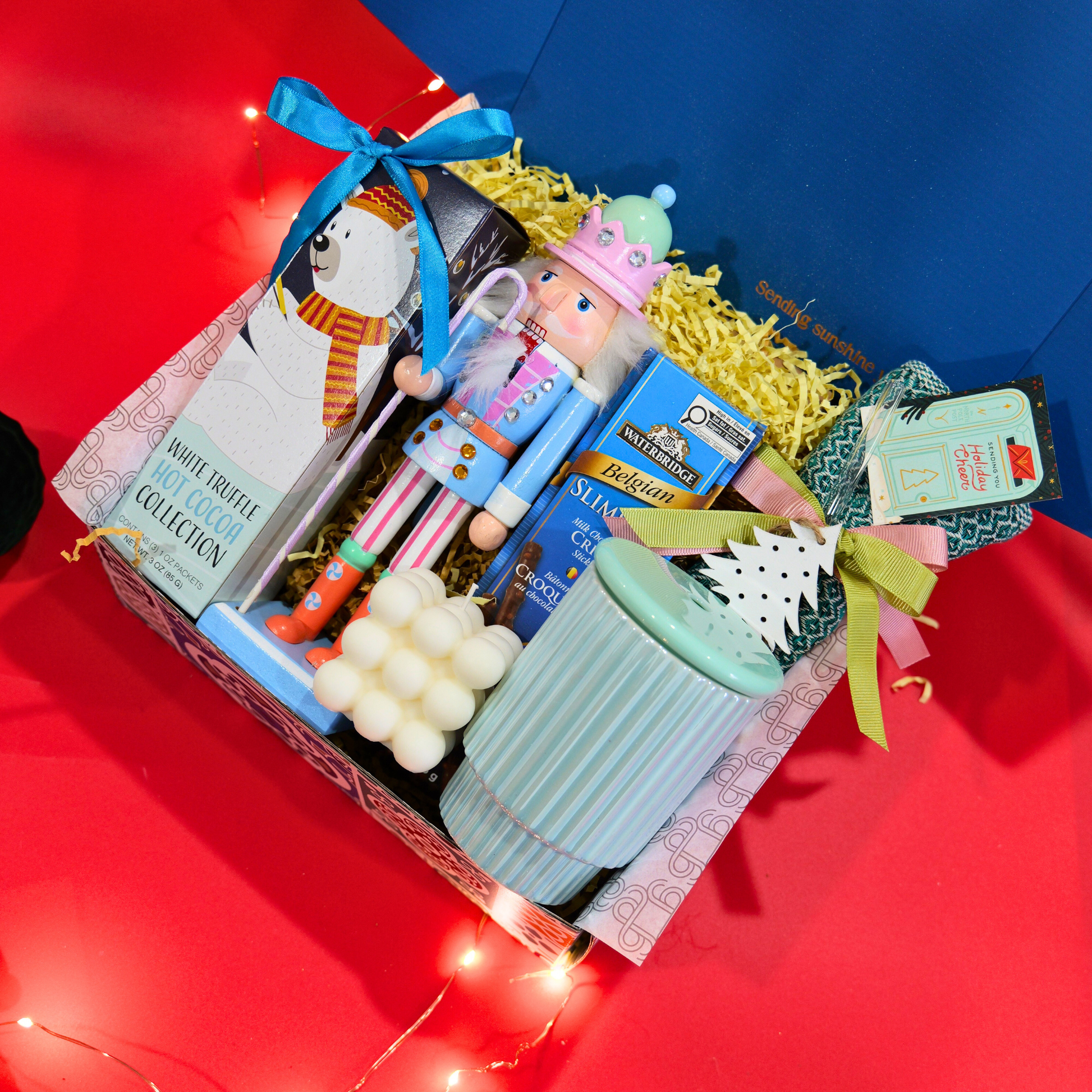 A festive Christmas gift basket featuring white hot chocolate, chocolate Slim Stix, a glass sipper, scented candle, nutcracker ornament, hand towel, and mini tree décor—perfect for gifting across Canada.