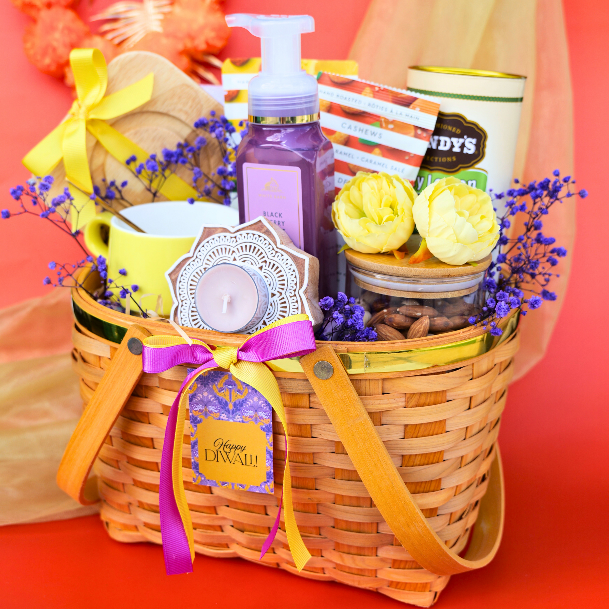 Bright, cheerful, and full of energy, the Pop of Happiness hamper is designed to spread joy through its vibrant purple and yellow theme. Packed with a thoughtful mix of gourmet treats, daily essentials, and festive décor, this basket is the perfect way to surprise loved ones. From indulgent cookies and flavored nuts to a stylish motel cup set and a decorative wooden flower diya, every element reflects thoughtfulness and celebration. A wonderful choice for Diwali, housewarmings, or simply to make someone’s day brighter.