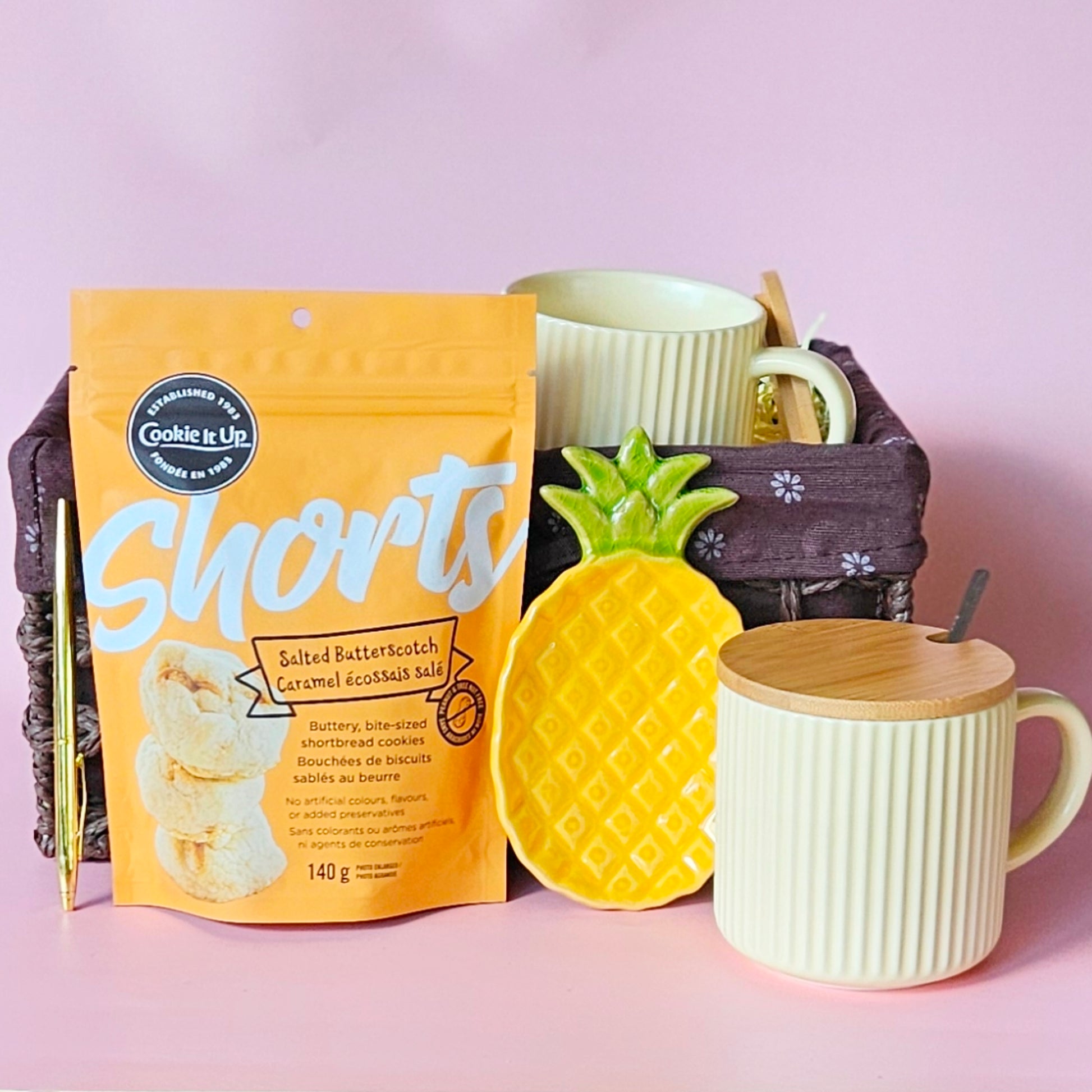 Celebrate your stylish employee with a fun, pineapple-themed corporate hamper! This distinctive gift features a chic Pineapple Trinket, a set of elegant coffee mugs with a wooden lid that can be engraved with your logo, a luxurious gold pen, and a pack of @cookieitup Salted Caramel Cookies. The hamper is personalized with your company logo on both the wooden lid and the pen, making it a perfect way to express appreciation to the fashion-forward individual in your office.