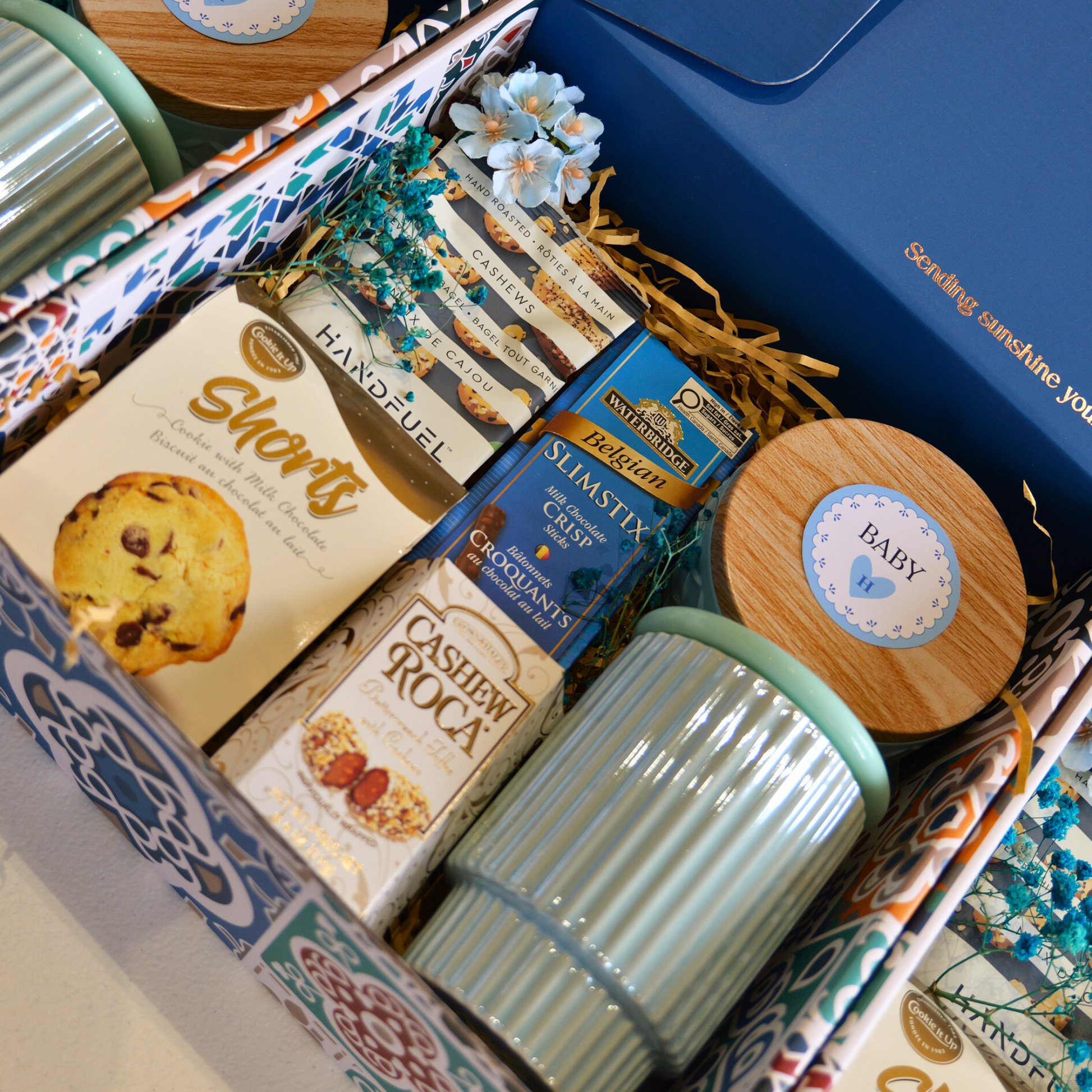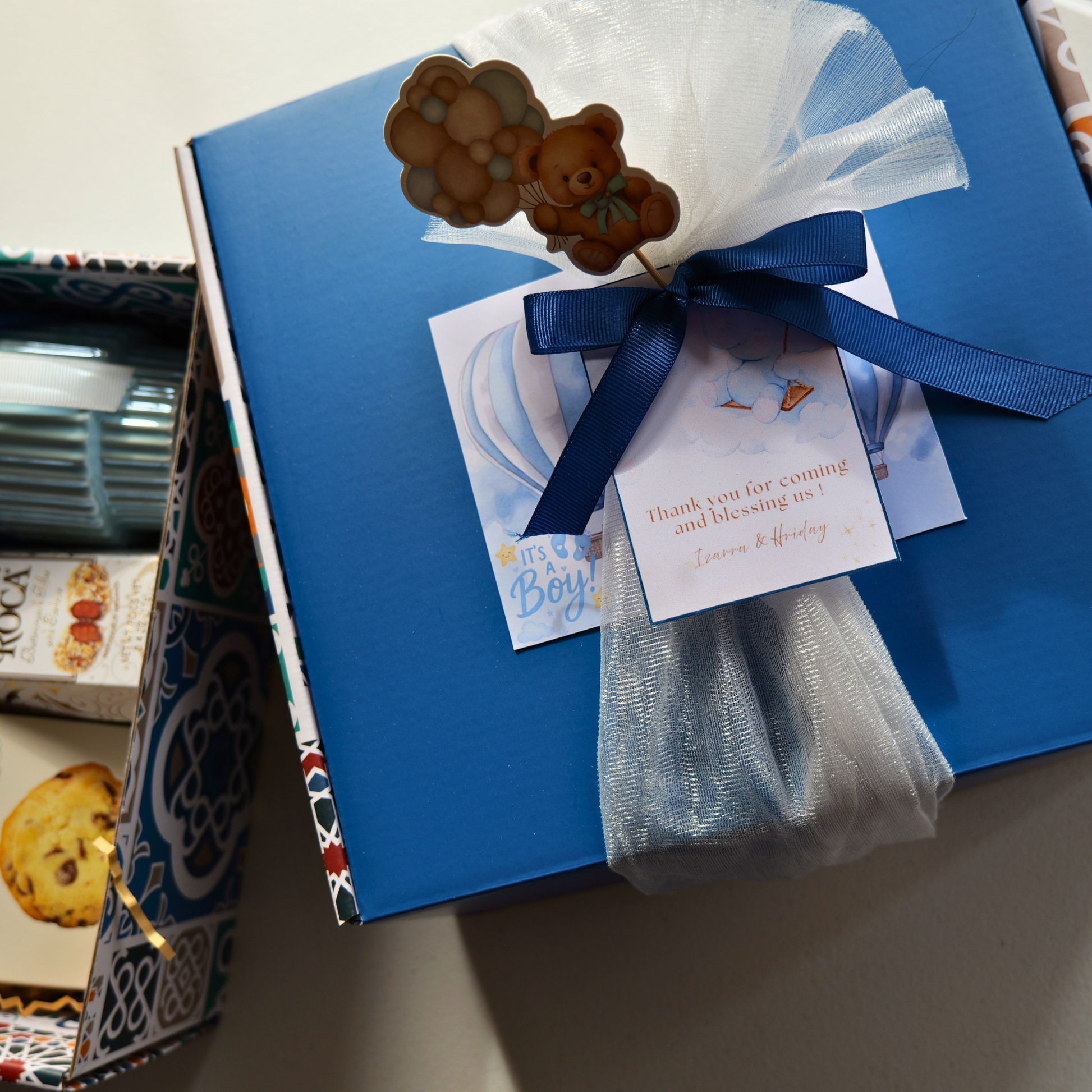 This featured hamper is a charming Teddy & Blue themed baby announcement gift box, designed in elegant shades of blue to celebrate the arrival of your little one. Every element inside the hamper follows the coordinated theme — from carefully selected blue-toned edibles to a stylish cold coffee sipper, creating a cohesive and premium presentation.